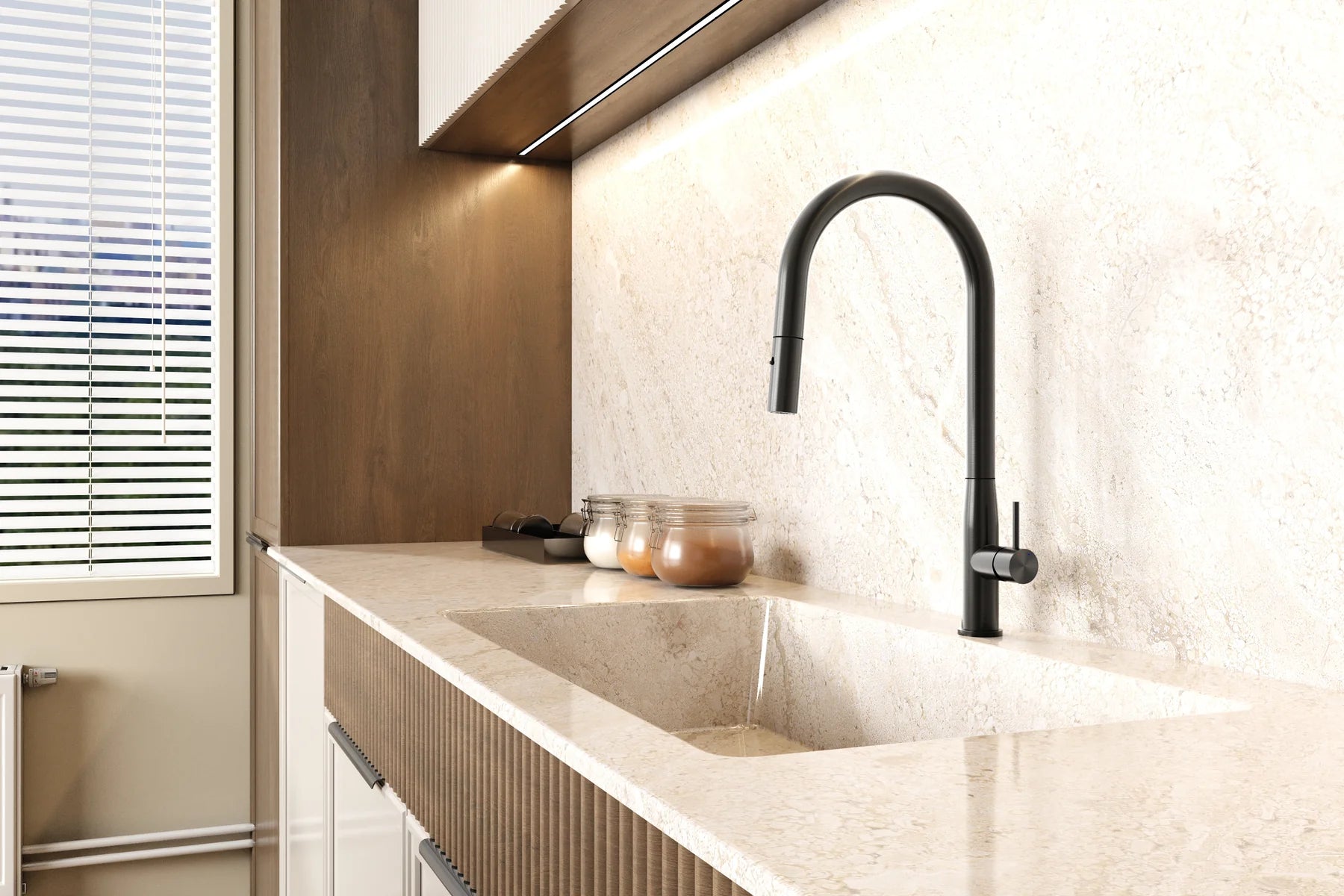 Premium pull-out kitchen faucet designed for modern homes. The flexible hose and 360° swivel spout allow you to direct water exactly where you need it, making everyday cleaning easier and more efficient. Equipped with international-brand components for long-lasting performance.