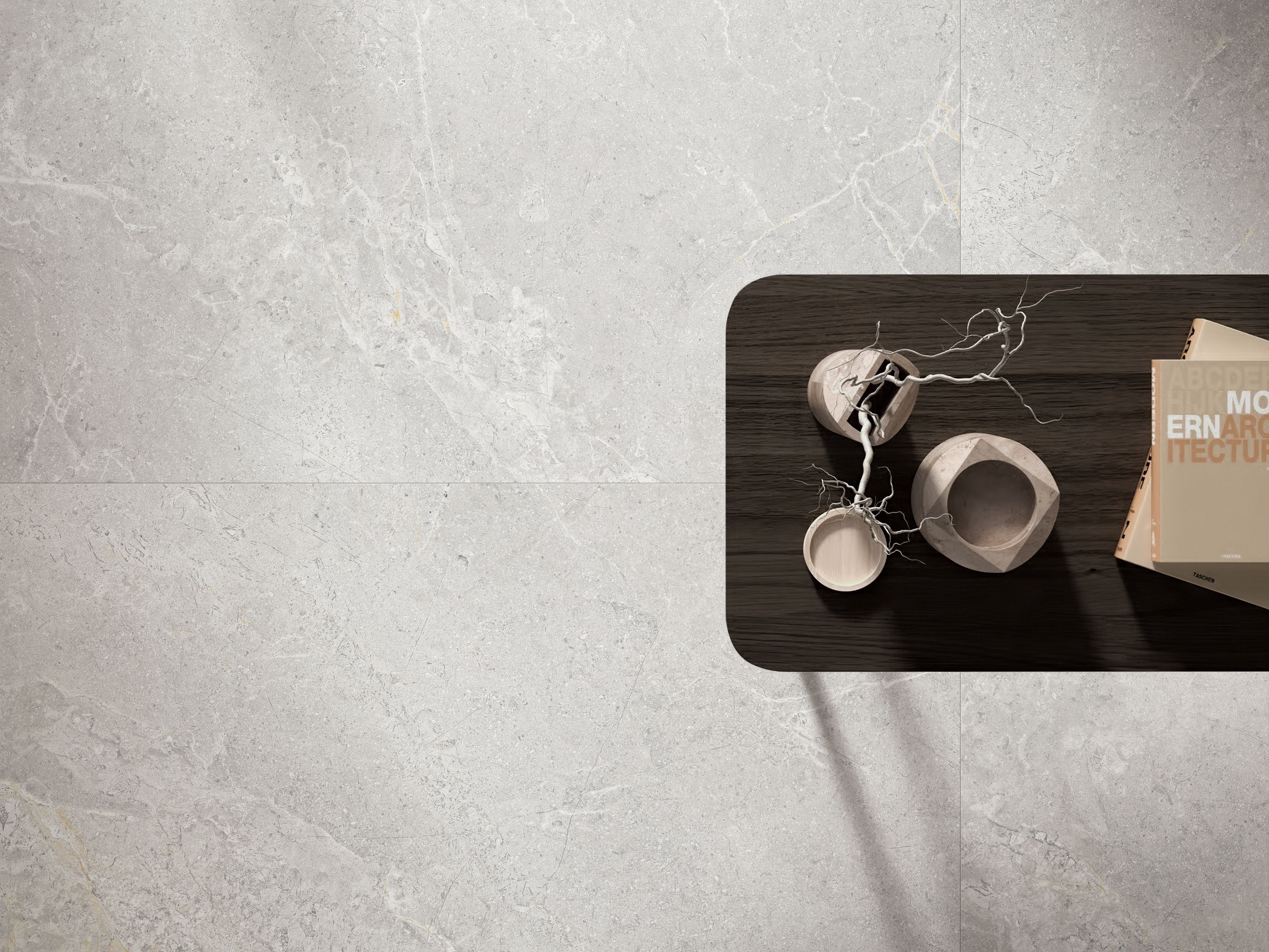 The collection draws its inspiration from Kavala Stone, a slate of Greek origin celebrated for its distinctive veining and beautiful color variations, ranging from creamy white to soft grey. This elegant reinterpretation captures the stone’s natural charm, infusing spaces with timeless sophistication and subtle character.