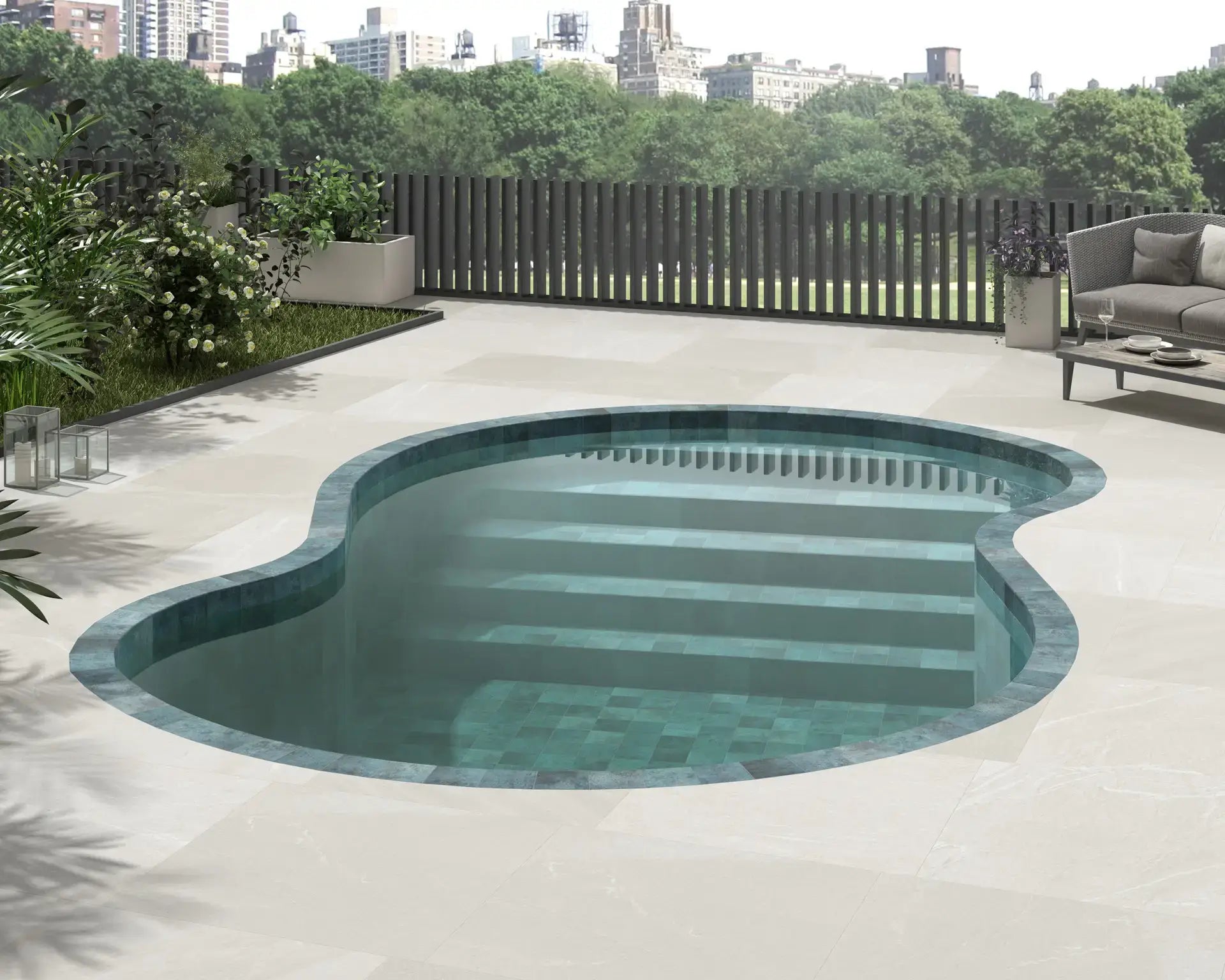 Available in Emerald and Turquoise, these tiles capture the luminous shades of the ocean, creating immersive surfaces for both walls and swimming pools. The collection is offered in Gloss for a radiant, water-reflective finish and Anti-Slip for enhanced safety in wet areas.